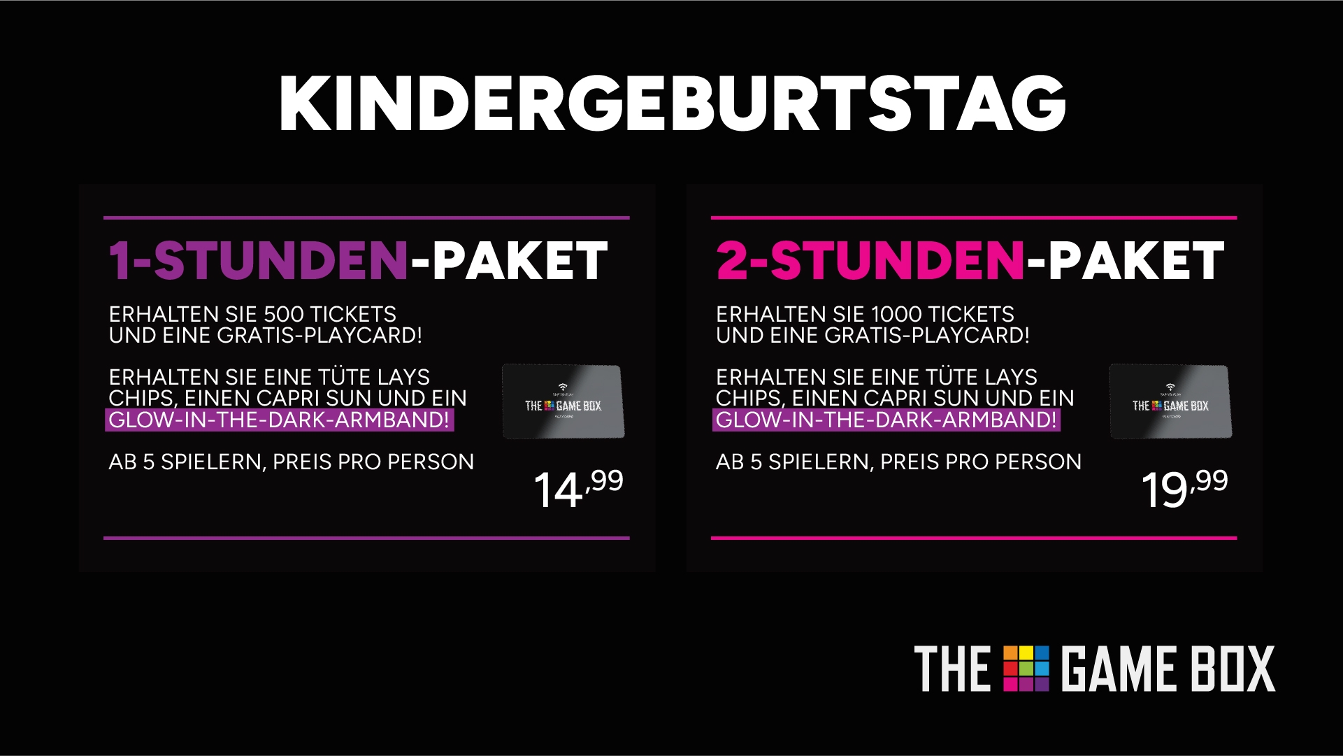 Mit einer Party bei The Game Box hast du garantiert Spaß und gehst mit einem coolen Goodiebag nach Hause. Dieses Spielpaket beinhaltet eine Playcard.